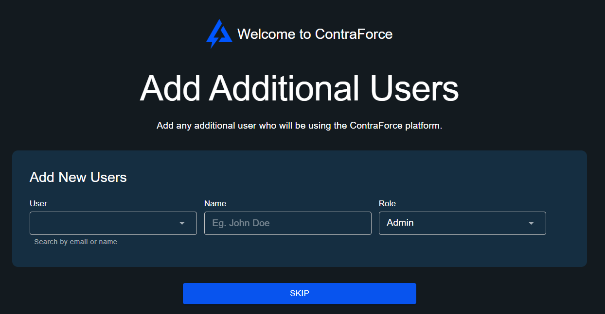 Once ContraForce modules have been deployed, the ContraForce Onboarding Wizard will provide the first opportunity to add users. The dropdown below the User title will pull users from the Entra ID associated with the tenant that is being onboarded to ContraForce. The first and last name of that user will be shown under the Name title. Finally, the correct role can be assigned to the user. A table showing the different capabilities of each role is shown below and additional information about ContraForce roles can be found here.