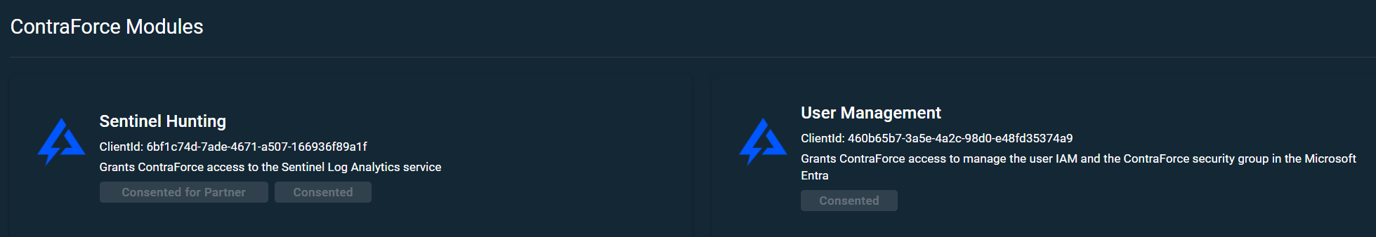 Once onboarding has completed, the first thing to do to manage users within ContraForce is to consent the User Management service principal. This can be found by viewing the tenant on the workspaces page and clicking the “gear” icon on the right side of the row for the workspace. All of the ContraForce Service Principals will be visible. Click Consent for the User Management service principal. Additional information about the User Management service principal can be found here.