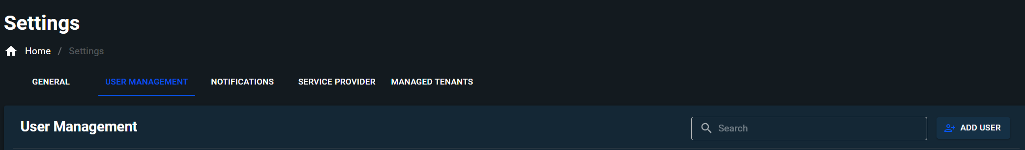New users can be added to the ContraForce Portal on the Settings > User Management tab. If your user has the correct permissions the “Add User” button will be available on the top right of the page next to the Search bar.