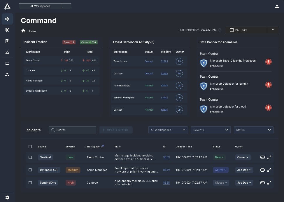 For each gamebook action that has been ran in ContraForce, the Workspace, Status, Incident, and Owner are shown. The specific incident ID is shown and is hyperlinked to the incident summary card.