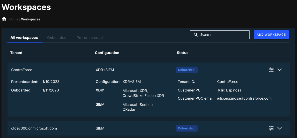 By default all tenants will be shown. Clicking Onboard or Pre-Onboarded will update the table to show the tenants with the corresponding Status. Clicking the drop-down arrow will expand the table entry to show additional information about the selected tenant.