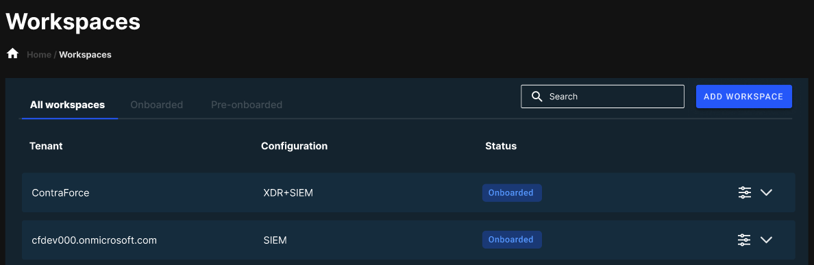 The Workspaces page serves multiple purposes. While information on pre-onboarding customer tenants is available here, this article will focus on the post-onboarding functionality within the Workspaces page.1. Navigate to the Workspaces page (3rd Icon - Triangle).