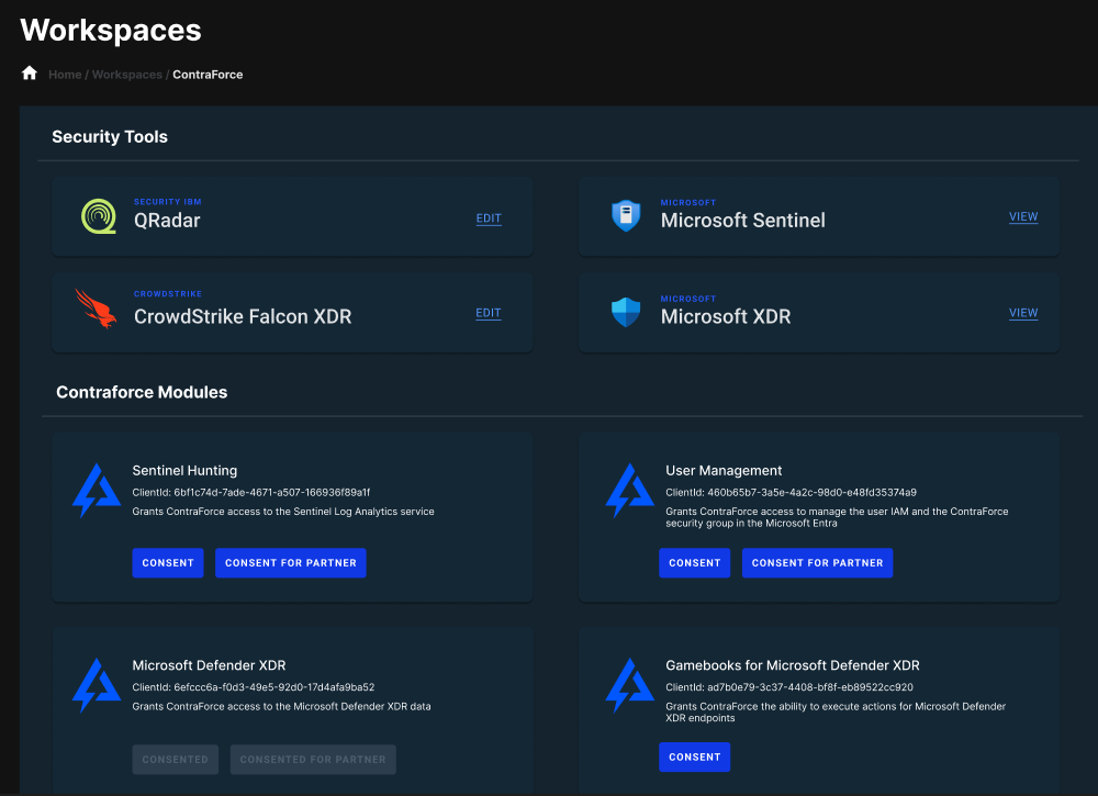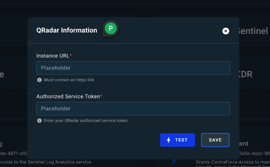 From here, the various modules that have been enabled for the tenant can be modified. Additionally permissions for the modules can also be consented. The screenshot below shows the fields that can be edited for QRadar.
