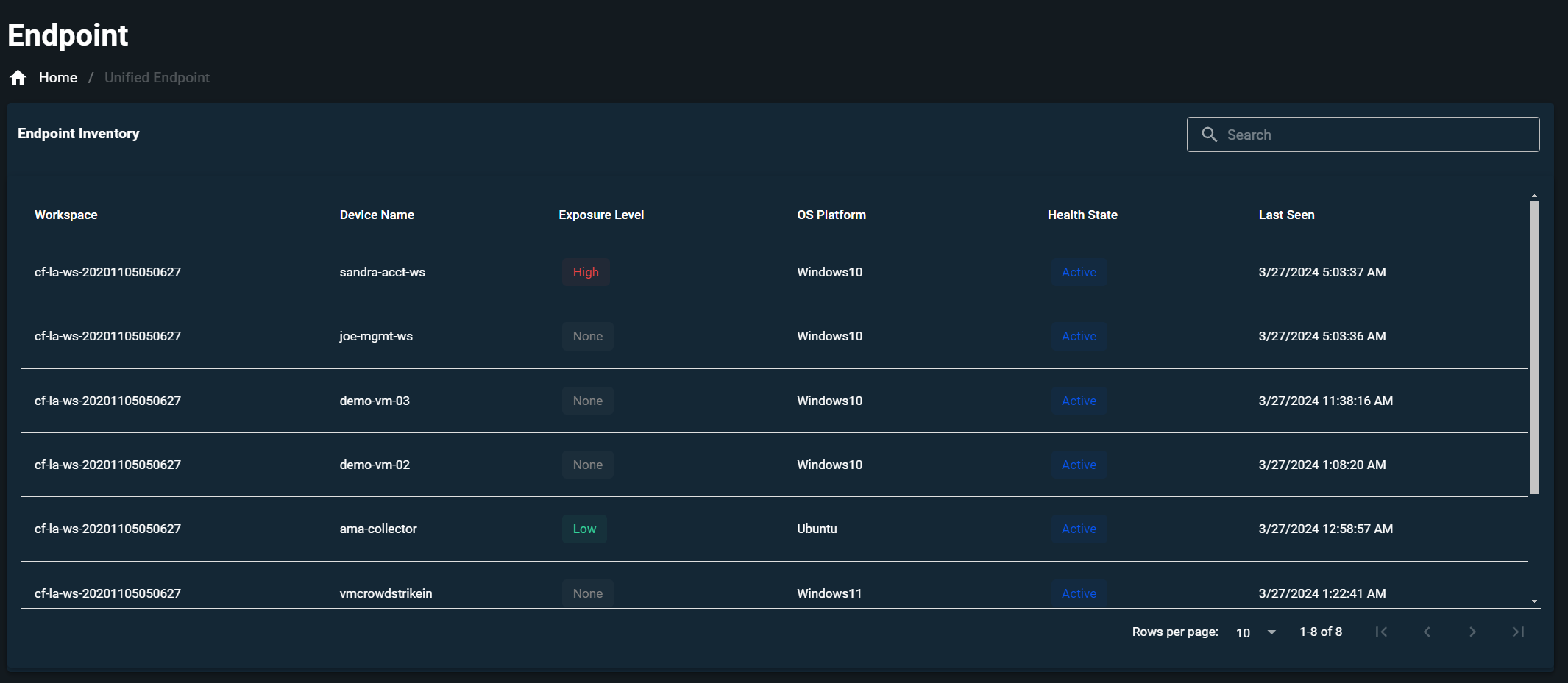 The Endpoint page will include columns for the Workspace name, Device Name, Exposure Level, OS Platform, Health State, and the Last Seen date.
