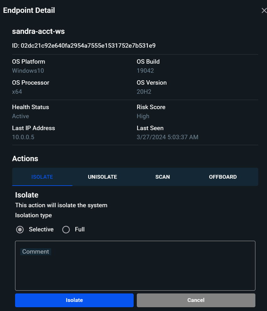 From here, actions such as Isolate, Unisolate, Scan, and Offboard can be ran on the device.