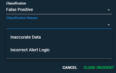False Positive should be selected when the incident was mistakenly triggered by incorrect logic in the incident itself or inaccurate data that was used to determine legitimacy of the incident. When selecting this option, you will notice you have the choice to classify between both of these triggers.