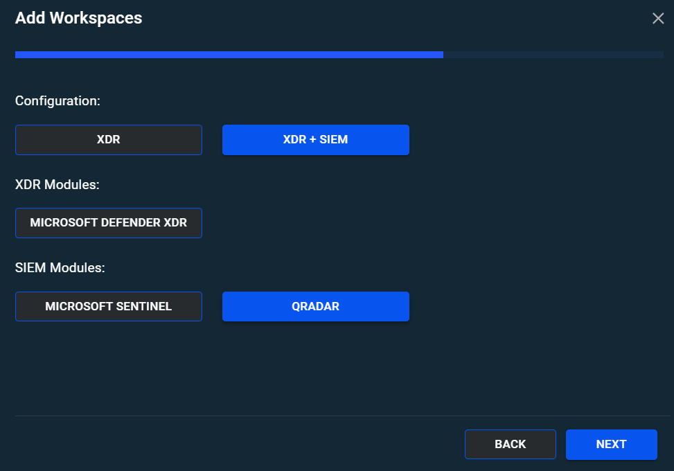 On the ContraForce Workspaces page, the environment can be pre-configured for QRadar. Start by adding the Tenant Name, Tenant ID, and Customer Admin Email for the account. Then select the XDR + SIEM configuration and QRadar will show as an option.